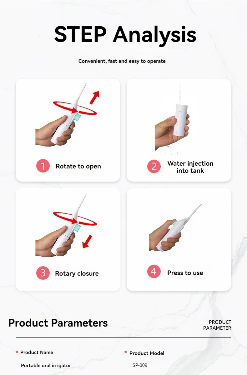 • تصميم محمول :مصممة للراحة ، هذا الري الفموي سهل الحمل ، مما يجعله مثاليًا للعناية بالأسنان أثناء التنقل.