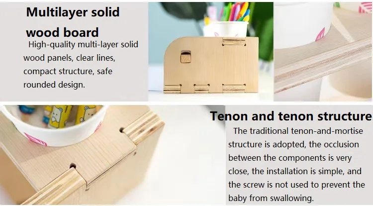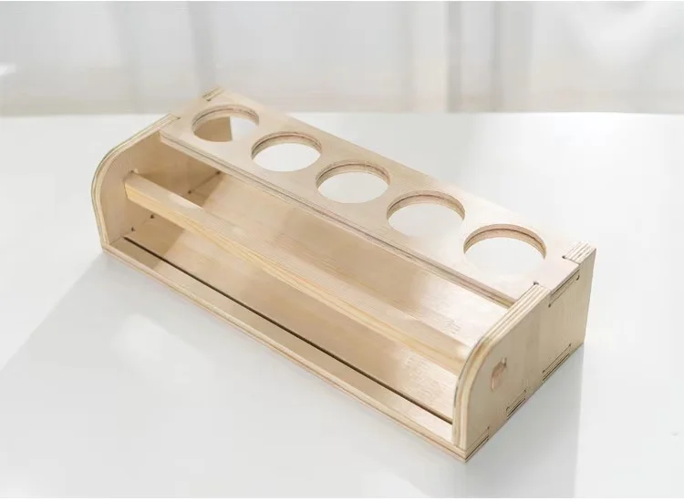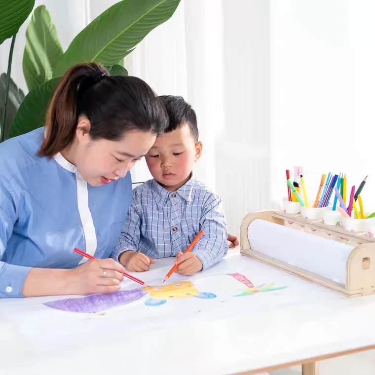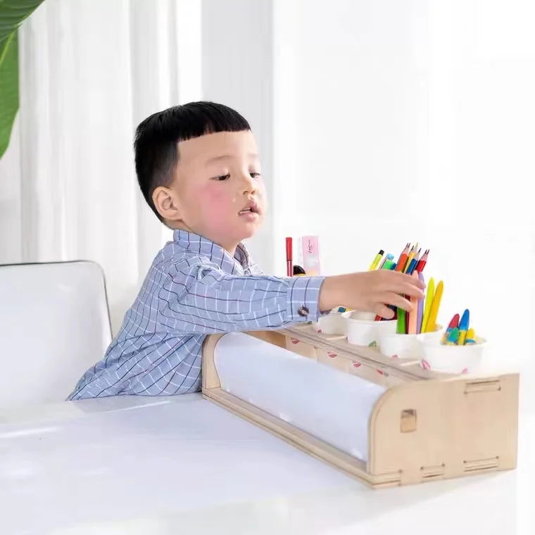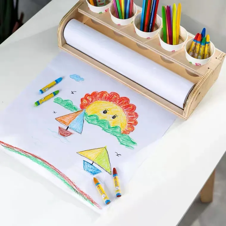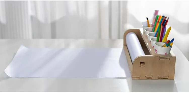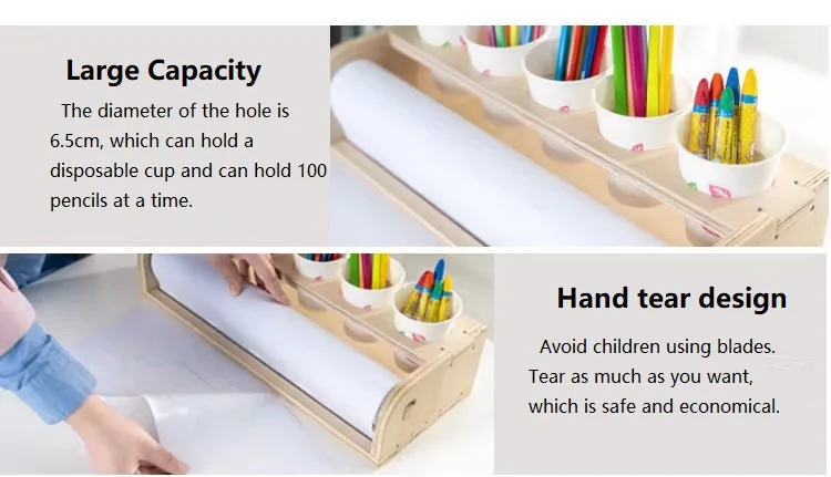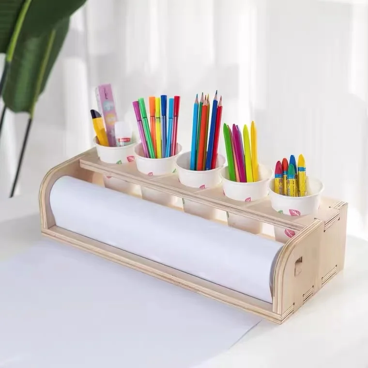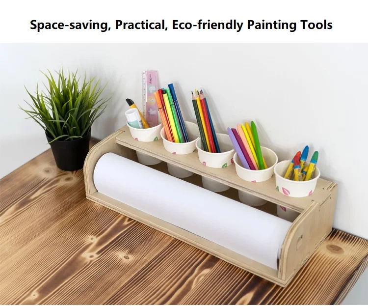 Kids Wooden Desktop Brush Pen Holder Modular Paint Rack Stand DIY Art Tools Storage Organizer W/ White Bond Paper Roll Dispenser